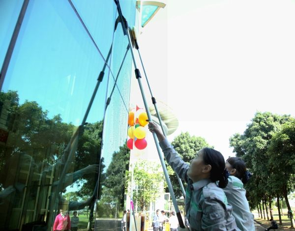 來自航站樓保潔部的黃明香和張月群不慌不忙,一人拿起玻璃刮,另一人則快速將羊毛套浸入稀釋的玻璃水中。只見由上而下,從左到右來回的幾下功夫便把玻璃清潔得閃亮光潔,最后以1分44秒的佳績勇奪桂冠,不愧是白云機場保潔的專業(yè)高手。